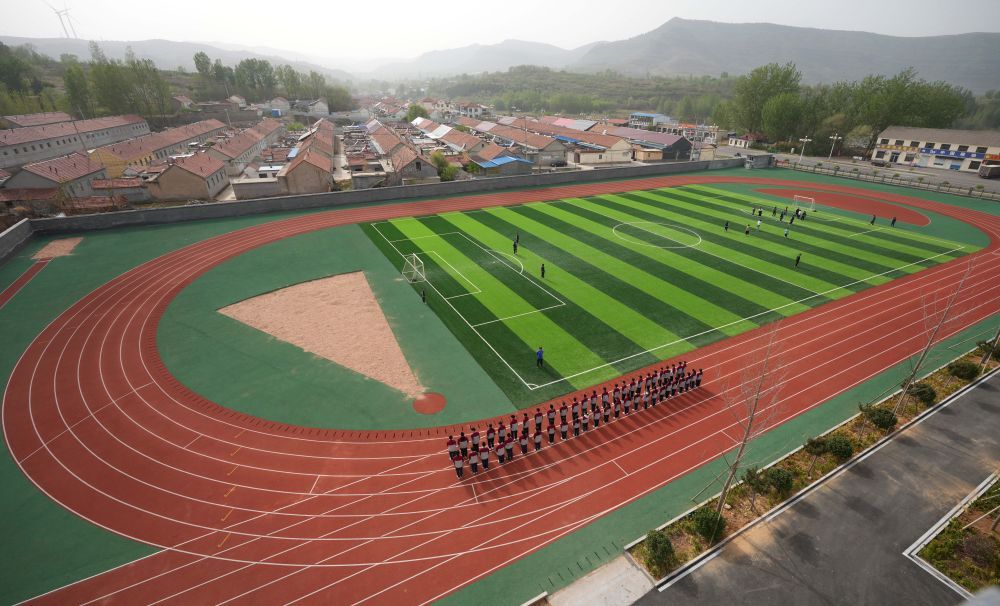 在位于山东潍坊市临朐县石家河村的临朐县弥水教育集团石家河校区,学生在操场塑胶跑道上进行体育锻炼(2025年4月17日摄)。新华社记者徐速绘摄