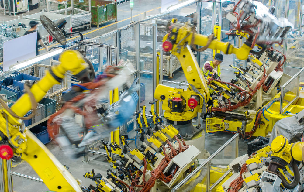 浙江省湖州市长兴经济技术开发区的长兴地通汽车部件有限公司技术人员操控工业机器人生产新能源汽车配件(无人机照片,2025年10月9日摄)。新华社发(谭云俸摄)