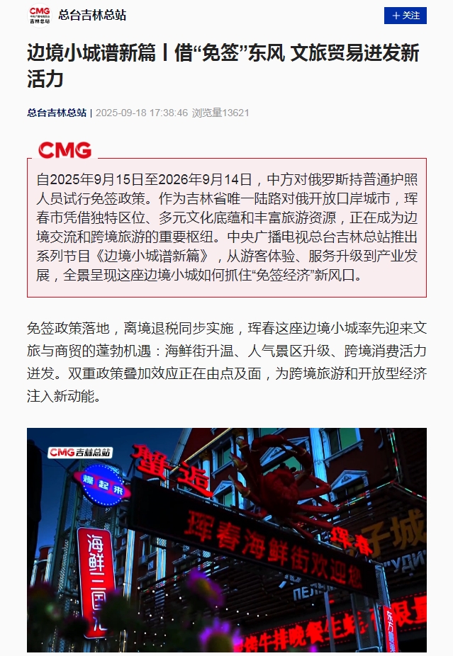 今年上半年,珲春互市贸易落地加工货值同比增长66.5%,展现强劲势头。随着中俄关系深化,跨境产业链持续拓展。从文旅消费到跨境电商,从离境退税到海鲜贸易,“免签经济”正在让珲春的“流量”变“留量”。在政策的撬动下,吉林正把边境优势转化为全域开放发展的新动力,跨境旅游与商贸联动,正在成为推动全省经济高质量发展的新引擎。