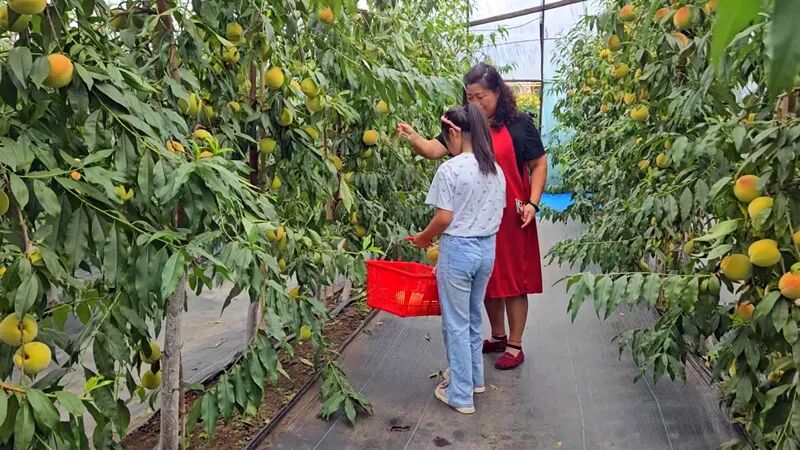 走进基地大棚,浓郁的果香扑面而来,饱满鲜亮的黄桃让人垂涎欲滴。“这黄桃又甜又多汁,特意来感受采摘的快乐,还能把新鲜的果子带给家人朋友!” 正在采摘的居民于萱手里捧着刚摘下的黄桃,脸上满是笑意。居民朱悦维则兴奋地展示着手中的果实:“你看这桃子,又红又圆,品相特别好,咬一口全是果肉,太满足了!”