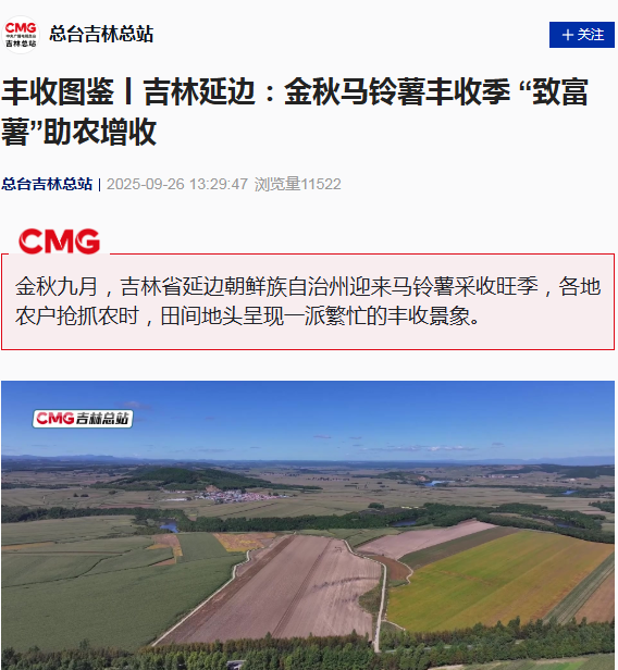 由延边广播电视台记者采写的新闻《吉林延边:金秋马铃薯丰收季 “致富薯”助农增收》9月26日被央视新闻客户端采用。