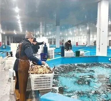 如今,不只是现场加工,随着直播等新业态的火爆,善于“唠嗑”的东北人在暂养池前架起手机,在屏幕前妙语连珠,售卖鲜活帝王蟹,依托便捷的物流,将一只只帝王蟹从这里发往全国多地。
