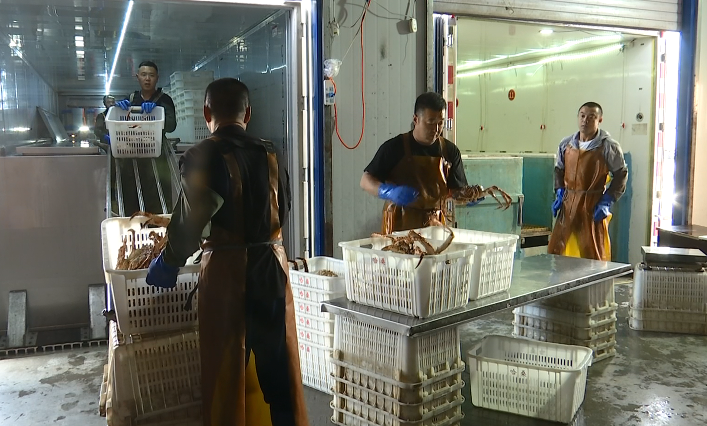 上午10点,冷链货车刚停稳,穿着防水围裙的工人便推着金属推车快步迎上,动作麻利地将肥美的帝王蟹、生猛的板蟹卸货入池。精心挑选后,为直播销售备足货源。珲春滨海海鲜批发行负责人刘野说:“今天进了5000斤货,明天晚上就可以发往北京、上海、成都,基本上两三天就发走了,剩下一部分我们在店里零售。每回到货,基本上全发走,卖得比较好。“