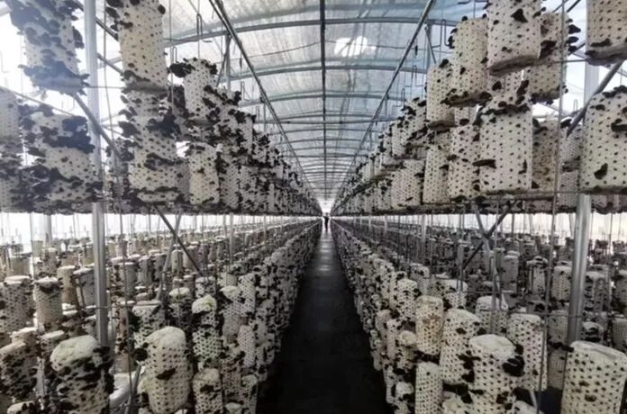 智能无人生产车间内,叉车有序穿梭,智能拌料、接菌、灭菌设备全流程自动化运行;温室吊袋大棚里,物联网设备实时监测温湿度,立体栽培的木耳长势喜人;农户和工人在标准化基地中采摘木耳,脸上洋溢着丰收的笑容。