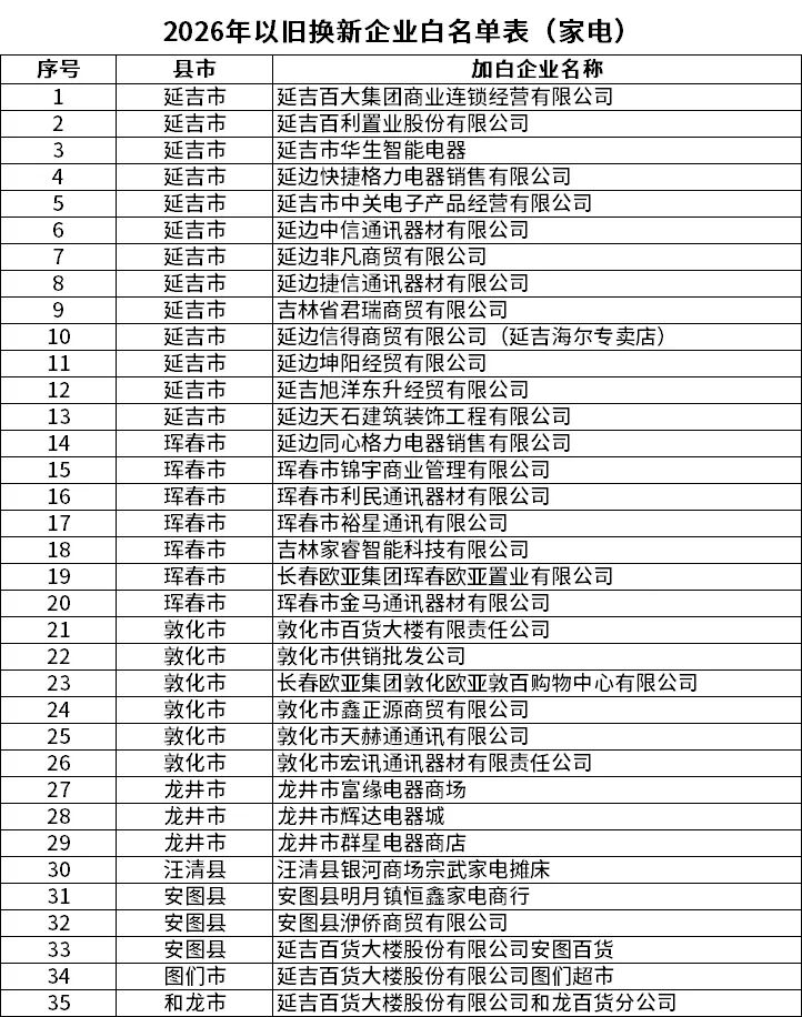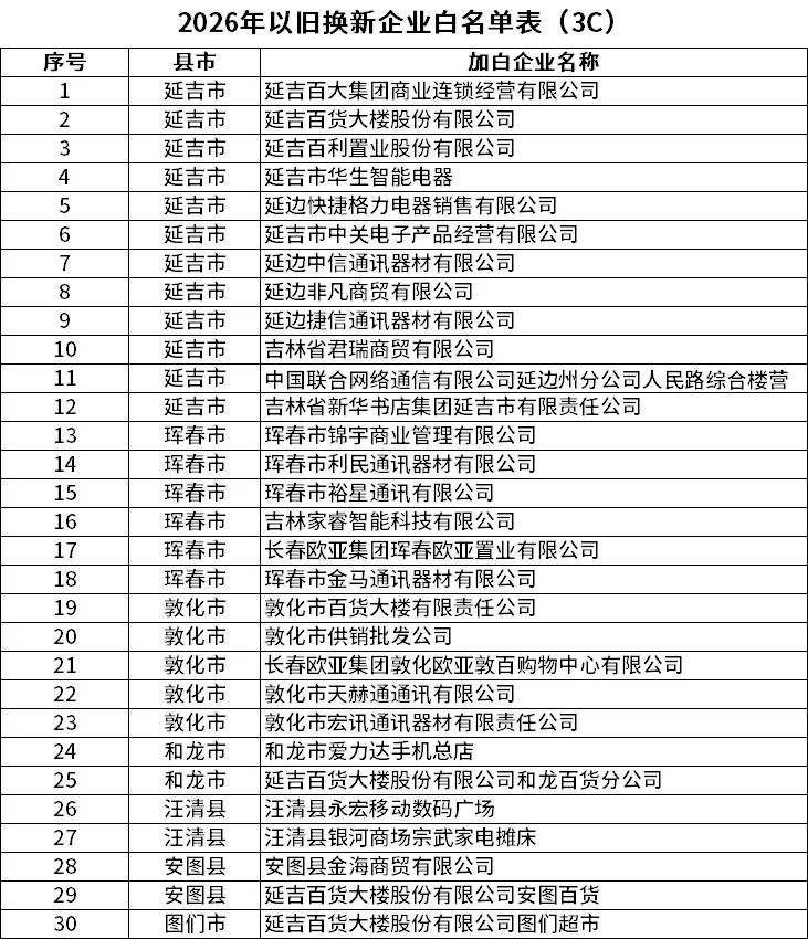 据了解,家电以旧换新与数码智能产品购新补贴活动自2026年1月1日11时起正式启动。补贴范围明确,个人消费者购买冰箱、洗衣机、电视、空调、电脑等6类1级能效或水效标准的产品,按产品销售价格的15%给予补贴。每位消费者每类产品可补贴1件,每件补贴不超过1500元。对个人消费者购买手机、平板、智能手表手环等4类产品,单件销售价格不超过6000元,按产品销售价格的15%给予补贴,每位消费者每类产品可补贴1件,每件补贴不超过500元。2024年、2025年已享受某类产品以旧换新补贴的个人消费者,2026年购买同类家电产品可继续享受补贴。本次活动有延吉市华生智能电器等35家企业参加家电以旧换新活动;延吉百货大楼股份有限公司等30家企业参加3C(数码和智能产品)以旧换新活动。