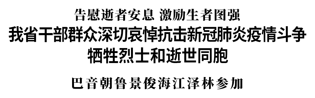 9时58分,省委主楼门前气氛肃穆,国旗降半旗志哀,“深切悼念新冠肺炎疫情牺牲烈士和逝世同胞”的黑底白字条幅格外醒目。省委、省人大常委会、省政府、省政协负责同志佩戴白花,神情凝重,庄严肃立。10时整,防空警报响起,巴音朝鲁、景俊海、江泽林等低头向在抗击新冠肺炎疫情斗争中牺牲的烈士和逝世同胞默哀3分钟。省领导高广滨、吴靖平、胡家福、王晓萍、李景浩、石玉钢、刘维、张忠、车秀兰、王绍俭、张焕秋、刘金波、李悦、安立佳、张志军、蔡东、韩福春、阿东、薛康、支建华、赵晓君、曹宇光、兰宏良、李维斗、郭乃硕,省人大常委会秘书长常晓春、省政府秘书长王志厚、省政协秘书长肖模文参加了集体哀悼活动。