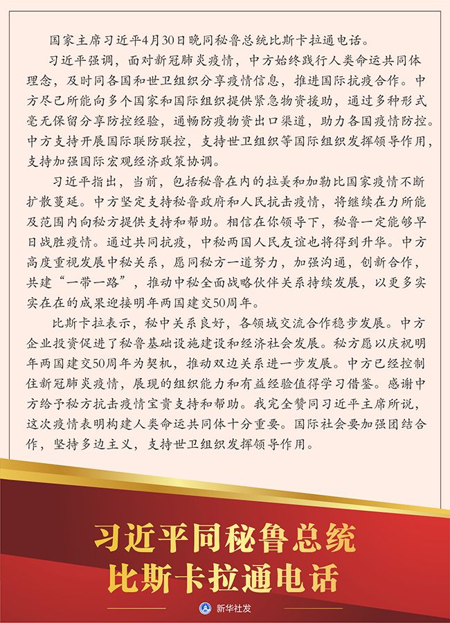 习近平指出,当前,包括秘鲁在内的拉美和加勒比国家疫情不断扩散蔓延。中方坚定支持秘鲁政府和人民抗击疫情,将继续在力所能及范围内向秘方提供支持和帮助。相信在你领导下,秘鲁一定能够早日战胜疫情。通过共同抗疫,中秘两国人民友谊也将得到升华。中方高度重视发展中秘关系,愿同秘方一道努力,加强沟通,创新合作,共建“一带一路”,推动中秘全面战略伙伴关系持续发展,以更多实实在在的成果迎接明年两国建交50周年。