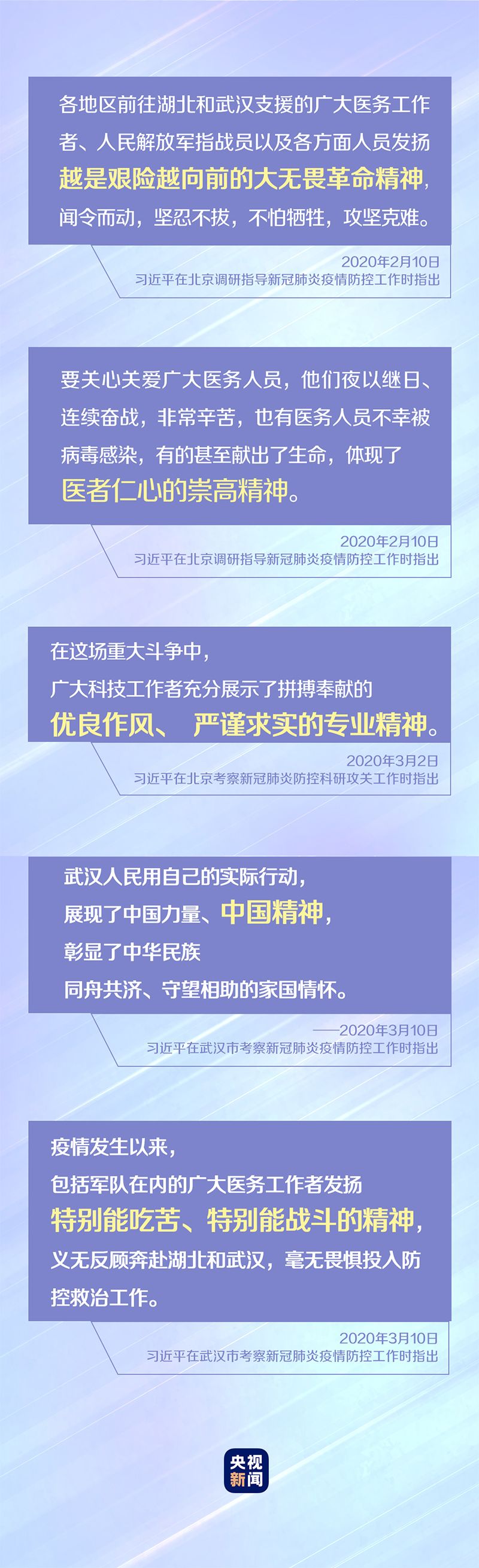 习近平总书记在北京和武汉考察时,疫情防控正处于关键时期。习近平高度赞扬医务工作者、科技工作者、武汉人民等不同群体在战“疫”中发扬的崇高精神。