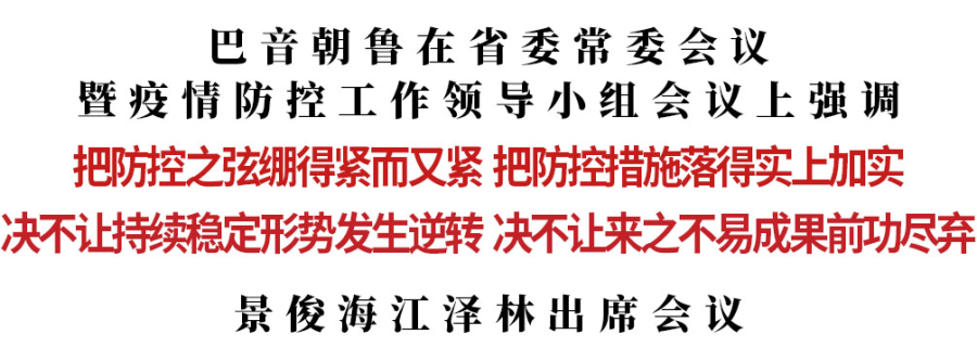 5月8日,省委书记、省疫情防控工作领导小组组长巴音朝鲁主持召开省委常委会议暨疫情防控工作领导小组会议,传达学习习近平总书记在4月29日和5月6日中央政治局常委会会议上的重要讲话精神,听取当前我省疫情防控重点工作汇报。他强调,要深入贯彻落实习近平总书记重要讲话精神,抓紧抓实抓细常态化疫情防控措施,把防控之弦绷得紧而又紧,把防控措施落得实上加实,坚决打好外防输入、内防反弹的攻坚战、持久战,决不让持续稳定形势发生逆转,决不让来之不易成果前功尽弃。省委副书记、省长、领导小组组长景俊海,省政协主席江泽林出席会议。
