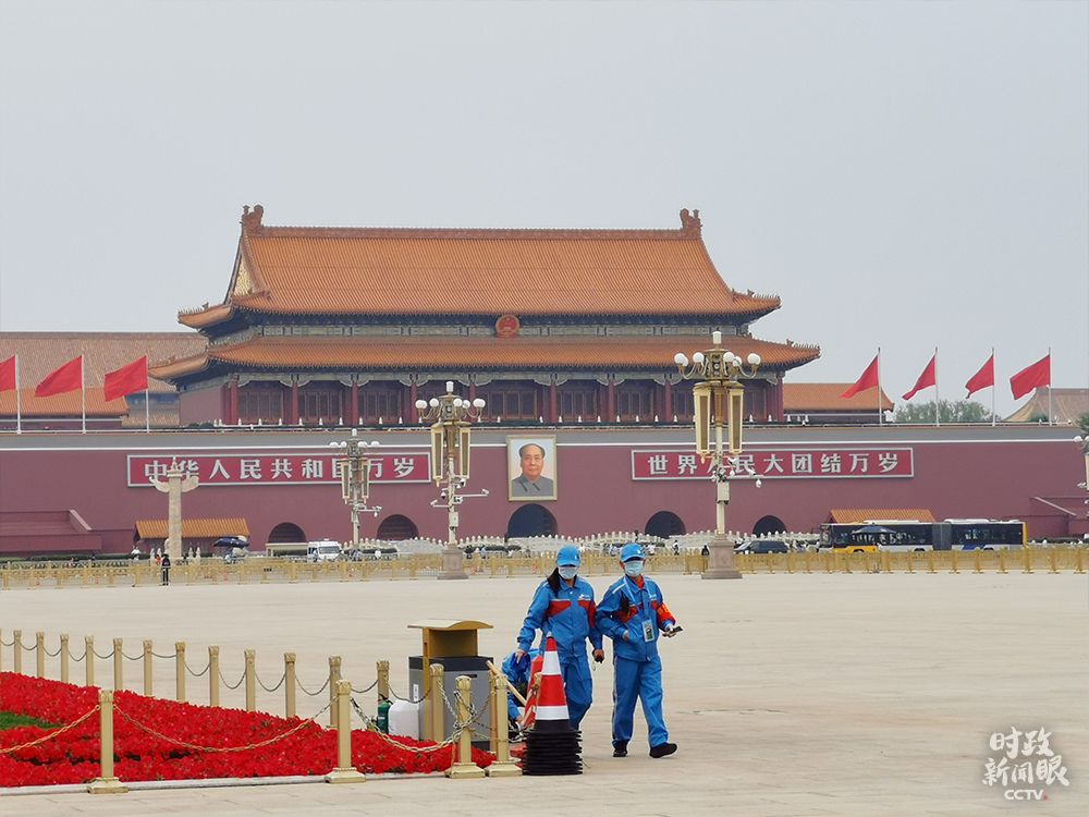 △政协委员抵达前,工作人员对天安门广场做最后的检查和清理。(总台央视记者李晓周拍摄)