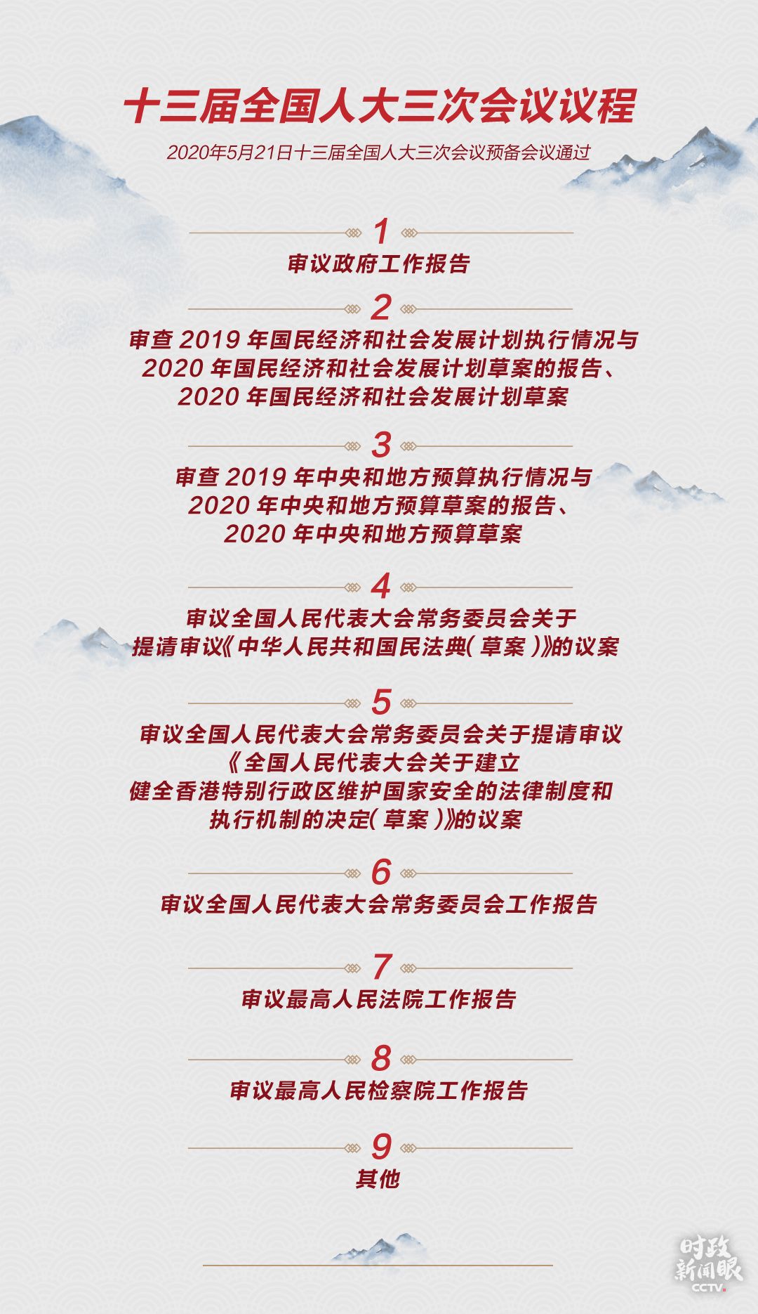 大会主席团第一次会议结束后,十三届全国人大三次会议发言人张业遂在当晚的新闻发布会上公布,这次大会会期7天,将于5月22日上午开幕,28日下午闭幕,共安排3次全体会议。大会共有9项议程。