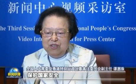 全国人大常委会香港特别行政区基本法委员会副主任 谭惠珠:保护国家安全,对香港而言,仍然是中央最终的权力和责任。所以现在的人大(决定)跟将来的常委会(立法)是根据宪法授予的权力,有法理上的依据和权力,不违背基本法。在香港而言,要长治久安,维护“一国两制”,一定要立国安法,使得这些人反中乱港的企图不能够得逞。