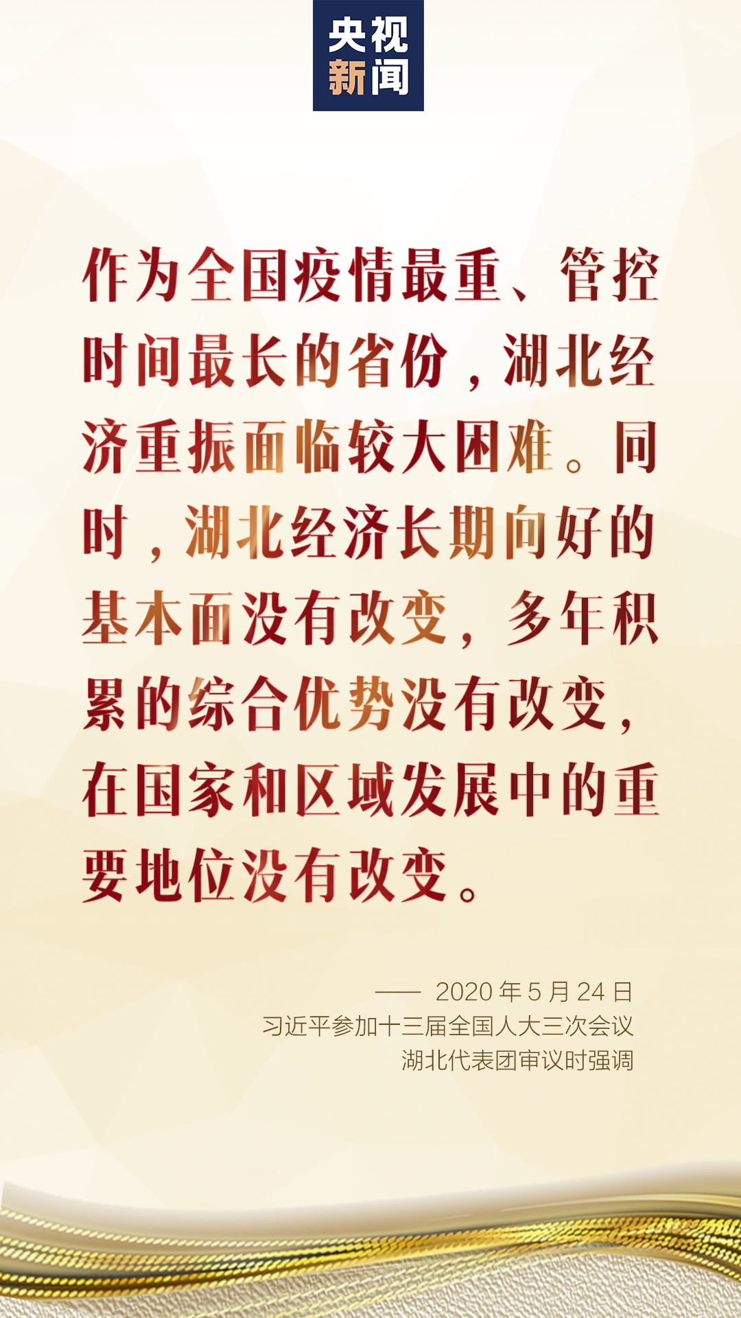 形势判断境外疫情扩散蔓延势头仍然没有得到有效遏制,国内个别地区聚集性疫情仍然存在,湖北有时还出现散发零星确诊病例,无症状感染者每天还有新增。作为全国疫情最重、管控时间最长的省份,湖北经济重振面临较大困难。同时,湖北经济长期向好的基本面没有改变,多年积累的综合优势没有改变,在国家和区域发展中的重要地位没有改变。