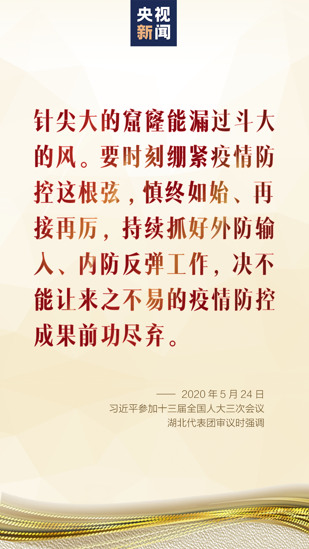 防控要求针尖大的窟窿能漏过斗大的风。要时刻绷紧疫情防控这根弦,慎终如始、再接再厉,持续抓好外防输入、内防反弹工作,决不能让来之不易的疫情防控成果前功尽弃。