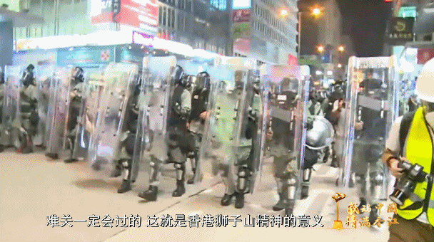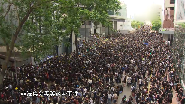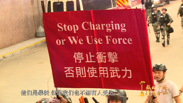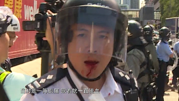 (时任)香港东九龙冲锋队高级督察 黄家伦:当我和我的队员到现场的时候,我们看到,马路上有六七十名暴力示威者,利用铁栏、垃圾桶以及一些杂物去堵塞车路,我们就进行了驱散行动,当时暴力示威者用一些硬物扔我们警察,包括砖头,水瓶,雨伞,头盔等等。