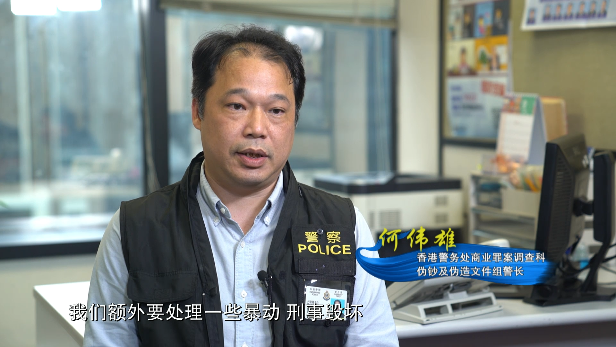 香港警务处商业罪案调查科伪钞及伪造文件组组长 何伟雄:以前我们做一些商业诈骗案件,后来除了这些案件之外,我们额外要处理一些暴力刑事破坏、非法集会等等事件,我们多了一倍工作量。