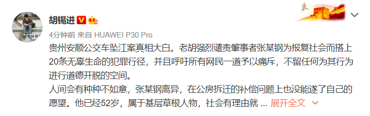 贵州安顺公交车坠江案真相大白。老胡强烈谴责肇事者张某钢为报复社会而搭上20条无辜生命的犯罪行径,并且呼吁所有网民一道予以痛斥,不留任何为其行为进行道德开脱的空间。
