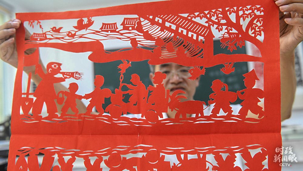△安徽阜阳市,剪纸艺术家葛庭友展示创作的“安全转移群众”作品。