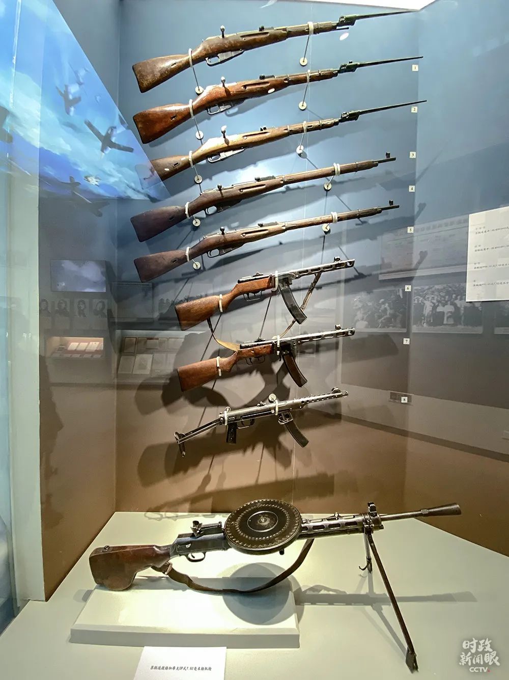 △图中最下面是捷格加廖夫轻机枪,弹盘装弹数量多。抗美援朝战场上,志愿军曾使用过这种火力凶猛的苏式机枪。(总台央视记者李辉拍摄)