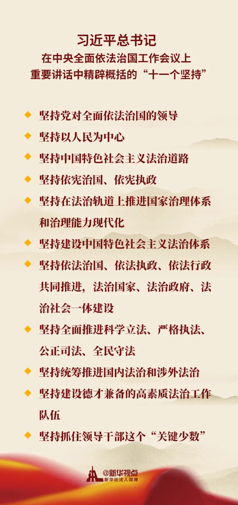 这“十一个坚持”,系统阐述了新时代全面依法治国的战略思想和工作部署,深刻回答了新时代为什么实行全面依法治国、怎样实行全面依法治国等一系列重大问题,是新时代全面依法治国的根本遵循和行动指南。