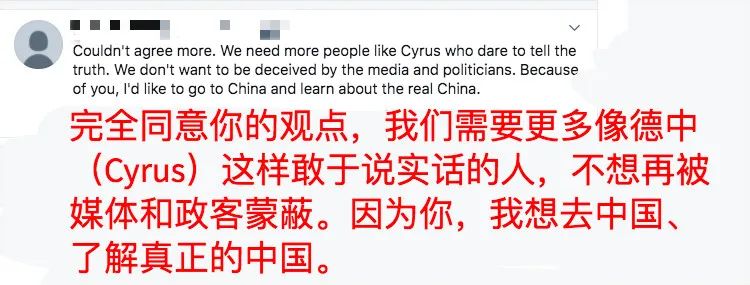 “完全同意你的观点,我们需要更多像德中(Cyrus)这样敢于说实话的人,不想再被媒体和政客蒙蔽,因为你,我想去中国、了解真正的中国。”