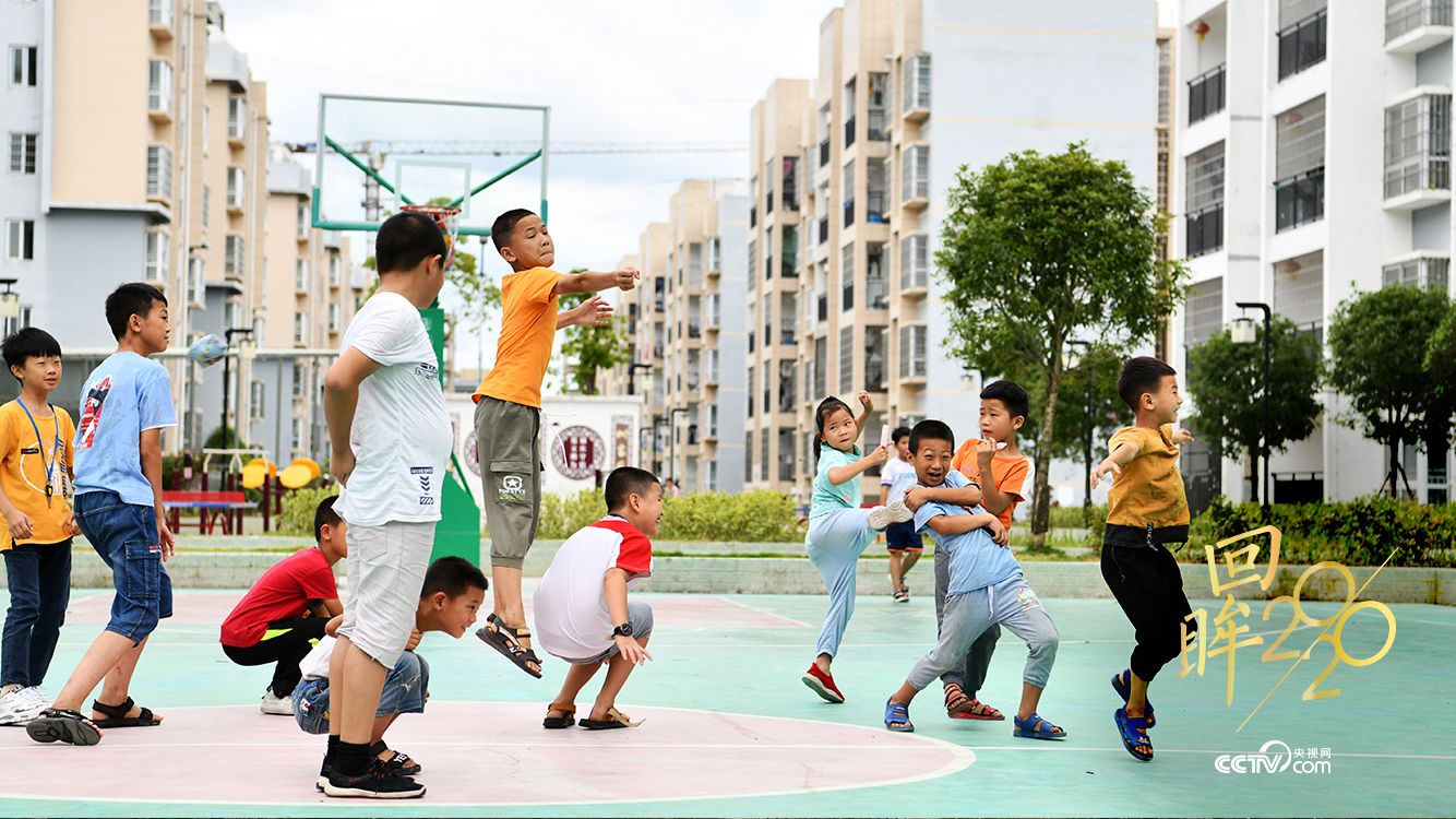 8月13日,在贵州省思南县双塘街道丽景社区易地扶贫搬迁安置点,孩子们在玩丢沙包。