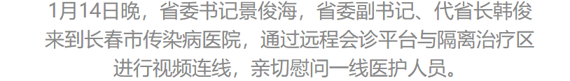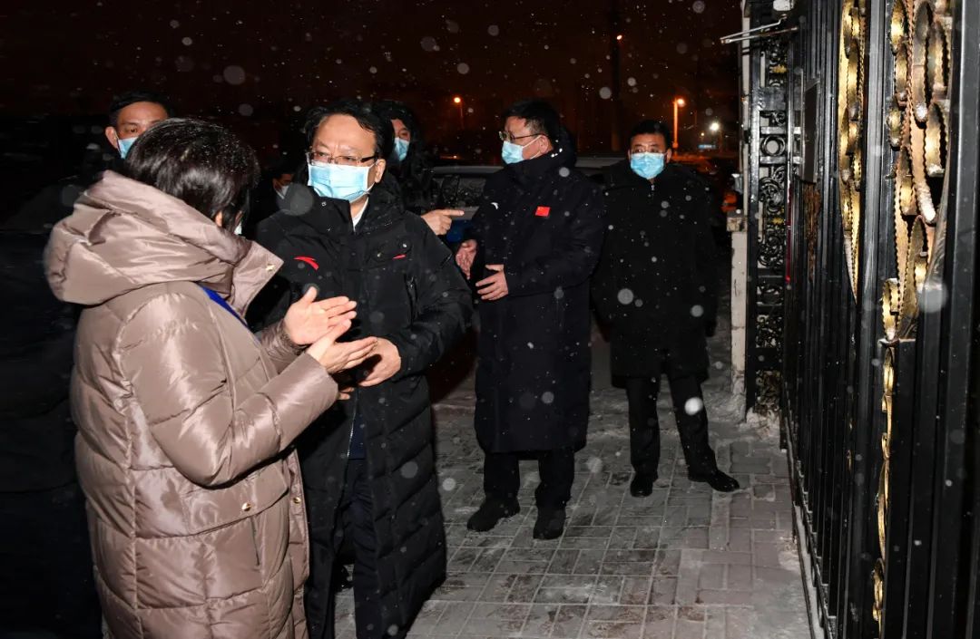 1月14日晚上,省部级主要领导干部学习贯彻党的十九届五中全会精神专题研讨班刚刚结束,省委书记景俊海,省委副书记、代省长韩俊立即返回长春,一下飞机就冒雪直奔长春市传染病医院、长春鲁辉国际城小区等处,实地检查疫情防控工作并强调,要深入贯彻习近平总书记重要讲话重要指示精神,坚持对人民极端负责的精神,落实“一精准三确保”要求,抓好隔离治疗和科学检测,精心筑牢防控铜墙铁壁,坚决遏制疫情扩散蔓延,切实保障人民生命安全和身体健康。