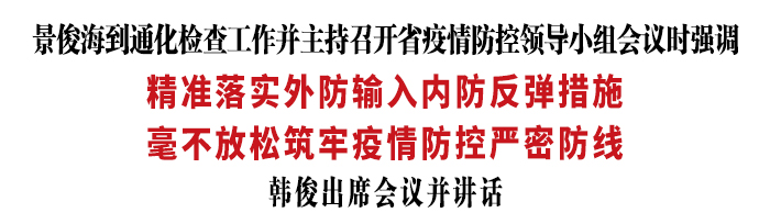 按照省委统一部署,昨天,省委、省政府领导同志分赴各地包保督导疫情防控工作。省委书记景俊海到通化市实地检查,并以视频连线形式主持召开省疫情防控领导小组会议,听取全省和长春、通化、松原疫情防控工作汇报。他强调,要深入贯彻习近平总书记重要讲话重要指示精神,坚持人民至上、生命至上,精准落实外防输入、内防反弹措施,毫不放松筑牢疫情防控严密防线,坚决打好打赢这场疫情防控阻击战。省委副书记、代省长韩俊在松原分会场出席会议并讲话。