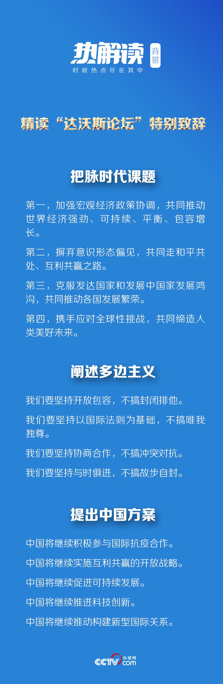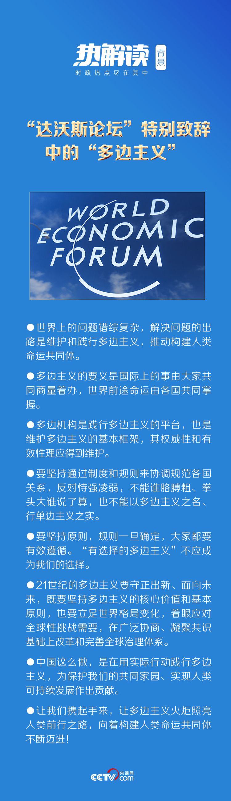 热解读1月25日晚,习近平主席在北京以视频方式应邀出席世界经济论坛“达沃斯议程”对话会,并发表题为《让多边主义的火炬照亮人类前行之路》的特别致辞。
