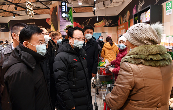 2月10日,省委书记景俊海来到红旗街万达广场永辉超市,就疫情防控、节日市场保供等工作进行调研,与正在购物的群众亲切交谈。