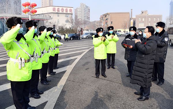 2月10日,省委书记景俊海慰问长春市宽城区交警大队一中队胜利公园岗执勤民警。