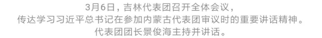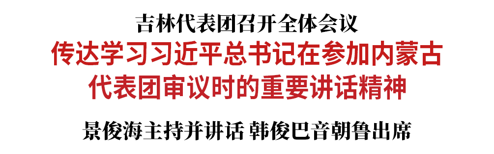 今天(3月6日)上午,吉林代表团召开全体会议,传达学习习近平总书记在参加内蒙古代表团审议时的重要讲话精神。代表团团长景俊海主持并讲话,副团长韩俊出席,巴音朝鲁、副团长金振吉出席。