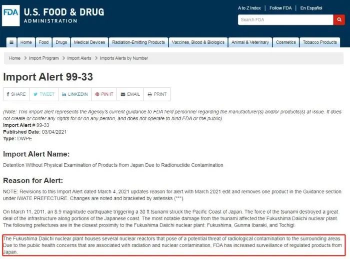 FDA还表示,由于“放射性核素污染”,相关部门应对日本产品进行扣留,而无需进行检查。