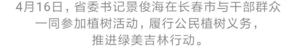 4月16日上午,省委书记景俊海,省委副书记、省长韩俊,省政协主席江泽林等省领导来到长春市明宇公园,与干部群众一同参加植树活动,履行公民植树义务,推进绿美吉林行动。景俊海强调,要深入学习贯彻习近平生态文明思想,牢固树立绿水青山就是金山银山理念,坚定不移走生态优先、绿色发展之路,扎实开展大规模国土绿化,在全社会倡导形成爱绿植绿护绿文明风尚,全面提升绿美吉林建设水平,加快打造生态文明建设强省。