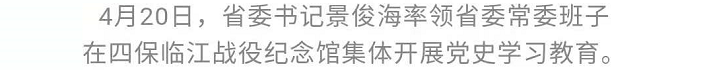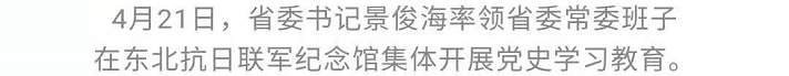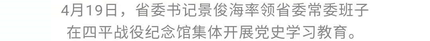 4月19日至21日,省委书记景俊海率领省委常委班子前往四平、白山、通化集体开展党史学习教育、开展为民服务,深入贯彻习近平总书记重要讲话重要指示精神,重温革命历史,感悟思想伟力,汲取奋进力量,把学党史悟思想实际成效体现到办实事开新局上,加快推动新时代吉林全面振兴全方位振兴。
