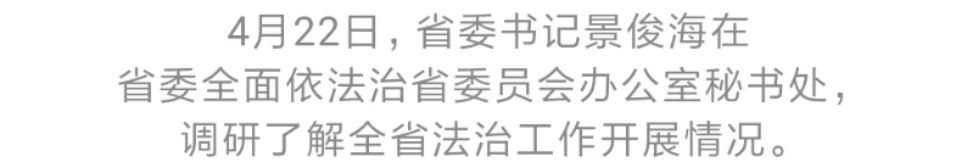 4月22日,省委书记景俊海到省司法厅、省监狱管理局,看望慰问司法行政战线干警,实地检查司法行政、监狱系统队伍教育整顿情况。他强调,要坚持以习近平新时代中国特色社会主义思想为指导,深入贯彻习近平法治思想,更加注重系统观念、法治思维、强基导向,统筹推进全面依法治省和法治吉林建设,为全面建设社会主义现代化新吉林作出新的更大贡献。