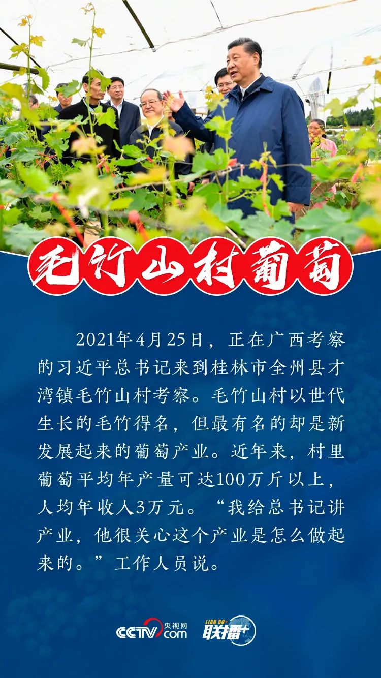 产业兴了,村民富了,山村活了。4月25日上午,正在广西考察的习近平总书记来到桂林市全州县才湾镇毛竹山村,实地察看了村里葡萄产业的发展情况。
