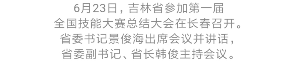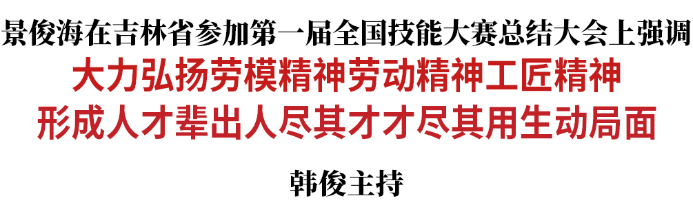6月23日,吉林省参加第一届全国技能大赛总结大会在长春召开。省委书记景俊海出席会议并讲话。他强调,要深入贯彻习近平总书记视察吉林重要讲话重要指示精神,认真落实李克强总理来吉考察指示要求,大力弘扬劳模精神、劳动精神、工匠精神,加快培养更多高素质技术技能人才、能工巧匠、大国工匠,努力形成人才辈出、人尽其才、才尽其用的生动局面。省委副书记、省长韩俊主持会议。