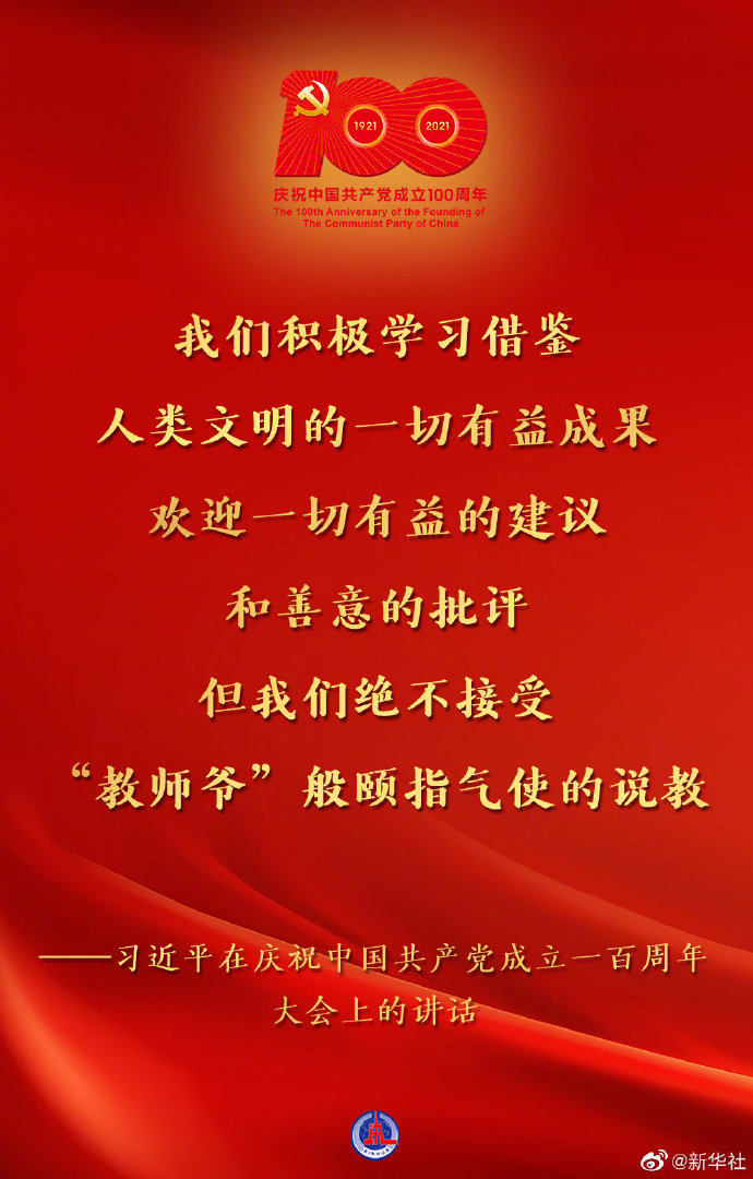 中华民族拥有在5000多年历史演进中形成的灿烂文明,中国共产党拥有百年奋斗实践和70多年执政兴国经验,我们积极学习借鉴人类文明的一切有益成果,欢迎一切有益的建议和善意的批评,但我们绝不接受“教师爷”般颐指气使的说教!中国共产党和中国人民将在自己选择的道路上昂首阔步走下去,把中国发展进步的命运牢牢掌握在自己手中!