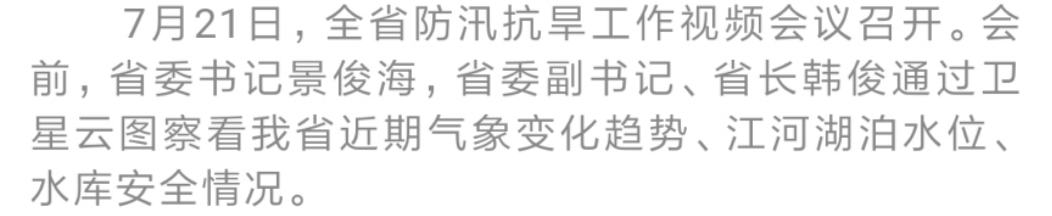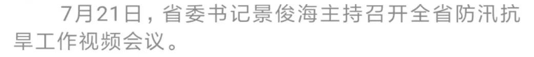 7月21日,省委书记景俊海主持召开全省防汛抗旱工作视频会议,传达学习习近平总书记关于防汛救灾工作的重要指示,对全省防汛抗旱工作进行再安排、再部署、再落实。景俊海强调,要深入贯彻习近平总书记重要指示精神,立足防大汛、抗大洪、抢大险、救大灾,坚持补短板、强弱项、堵漏洞、排隐患,坚决做到科学应对、精准防范、安全度汛,确保人民群众生命财产安全。省委副书记、省长韩俊出席会议。