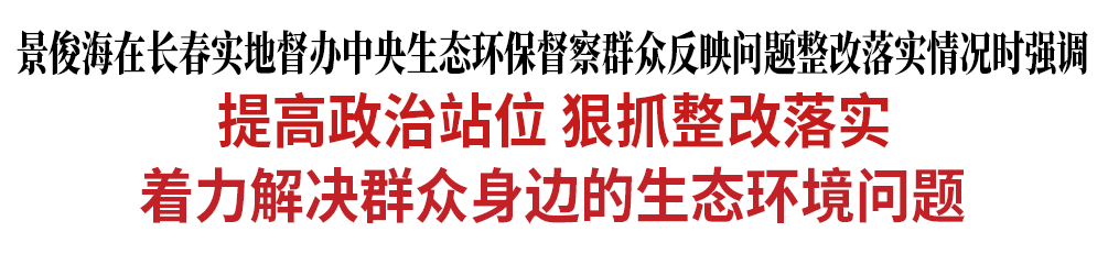 督办中,景俊海强调,主动配合中央生态环保督察,抓好群众反映问题整改,是我们必须完成好的重大政治任务。要坚持统一思想、深化认识,切实增强责任感使命感,立行立改、依法依规、全面彻底整改到位,着力解决好群众反映强烈的生态环保问题,真正让群众感受到实实在在的变化。要坚持倒排工期、挂图作战,建立台账、销号管理,确保按时序推进、高质量完成整改任务;全力办好中央生态环保督察组转办的信访案件,办理进度要及时向群众说明,办理结果要及时向社会公开,努力提高工作透明度和群众满意度。要坚持举一反三、全面排查,对标对表中央生态环保督察组要求,强化综合治理、系统治理、源头治理、标本兼治,彻底解决一批大气、土壤、水等方面重点难点问题,坚决打赢污染防治攻坚战,守护好吉林大地的绿水青山黑土地,守护好人民群众的蓝天白云好空气。要坚持强化领导、压实责任,各级党委政府要肩负起主体责任,“一把手”要认真履行第一责任人责任,各项工作、各个问题要有专人专班负责,各有关部门单位要搞好协调配合,确保问题整改取得扎实成效。