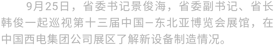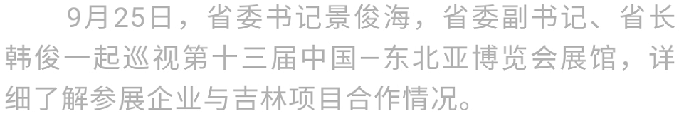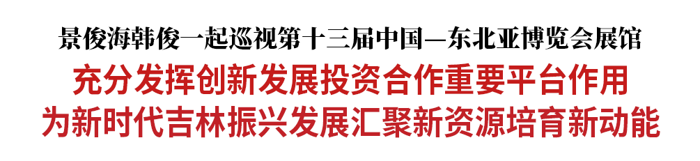 9月25日,省委书记景俊海,省委副书记、省长韩俊一起巡视第十三届中国—东北亚博览会展馆。景俊海强调,要深入贯彻习近平总书记视察吉林重要讲话重要指示精神,扎实做好博览会各项组织工作,充分发挥创新发展、投资合作重要平台作用,为新时代吉林振兴发展汇聚新资源、培育新动能。