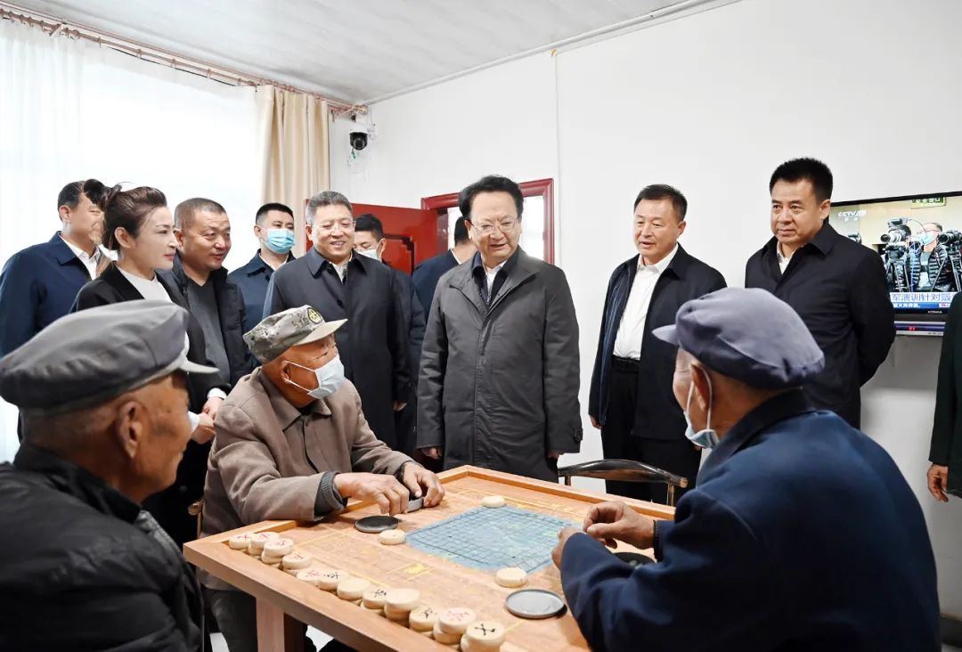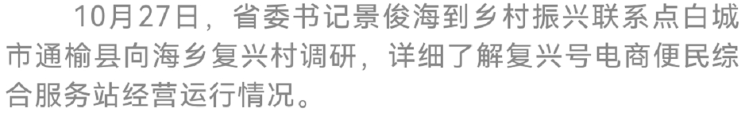 今年5月,景俊海曾到复兴村调研。时隔近半年,他再次来到复兴村。看到村里村容村貌干净整洁、产业发展有声有色、群众生活持续改善,景俊海非常高兴。他走进向海复兴肉牛养殖园,实地察看项目建设进展情况,要求沿着养殖产业链条,大力发展食品深加工业,加大技术培训力度,促进农民就地就近就业。健全完善利益联结机制,发挥好养殖保险作用,促进产业收益优先保障脱贫户。在新建的复兴村党群服务中心,景俊海强调进一步完善农村基础设施,增强农村公共服务能力,努力让群众获得感幸福感更加实在、更可持续。景俊海仔细检查村支部建章立制等工作情况,要求坚持以百姓之心为心,切实解决好事关群众利益的急难愁盼问题,真正把为民服务贯穿于工作中、落实到行动上。景俊海来到“孝老餐厅”,与正在活动的老人亲切交流,叮嘱村干部创新敬老服务模式,更好满足老年人多样化需求。复兴号电商便民综合服务站正在进行电商直播,推销当地特色农产品,景俊海强调,要准确把握电商直播业态发展规律,实行差异化市场策略,更好兑现特色产品价值。在脱贫户侯凤云、姜广成家中,景俊海仔细翻阅帮扶手册,了解他们的生活、健康、收入等情况,鼓励他们不等不靠、勤劳致富,努力创造幸福生活,与全省各族群众一道实现共同富裕。