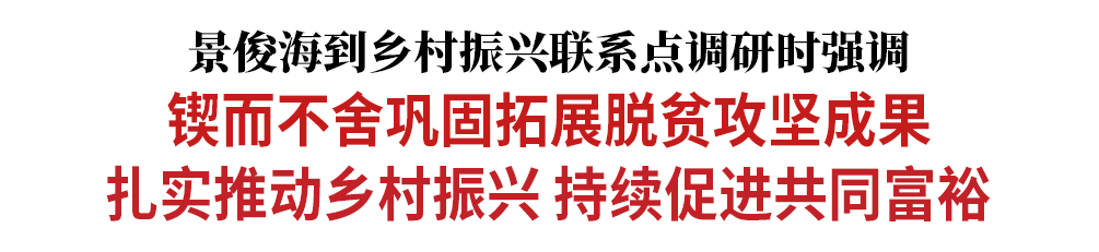 调研中,景俊海主持召开汇报会,听取通榆县、向海乡、复兴村乡村振兴工作情况,并与驻村第一书记、群众代表深入交流。景俊海强调,全面推进乡村振兴,是加快新时代吉林振兴发展的必然要求,是促进全体人民共同富裕的必由之路。一要坚持不懈巩固拓展脱贫成果,严格落实“四个不摘”要求,继续做好防止返贫监测和动态帮扶工作,确保脱贫户不返贫、边缘户不致贫。二要坚持不懈夯实发展致富根基,坚持项目为王、项目带动,打造科技平台,强化金融支撑,因地制宜发展电子商务、特色种植、庭院经济等特色产业,加快一二三产融合发展,延长产业链条,放大带动效应,努力让更多农民参与受益。三要坚持不懈提升乡村治理水平,常态化开展村庄清洁行动,深入推进农村厕所革命,持续提升农村公共服务水平,依法化解乡村矛盾问题,引导群众自觉做到爱党爱国、向上向善、孝老爱亲、重义守信、勤俭持家。四要坚持不懈推进“人”兴促振兴,面向乡村育人才、苦口婆心留人才、千辛万苦引人才、海纳百川用人才,有效积聚乡村人气,创新乡村人才职称评价机制,着力培养新型职业农民,激励各类人才投身乡村振兴。五要坚持不懈打造坚强战斗堡垒,以抓党建促乡村振兴,抓好农村“双带头人”队伍和第一书记队伍建设,不断打牢乡村振兴的组织基础。