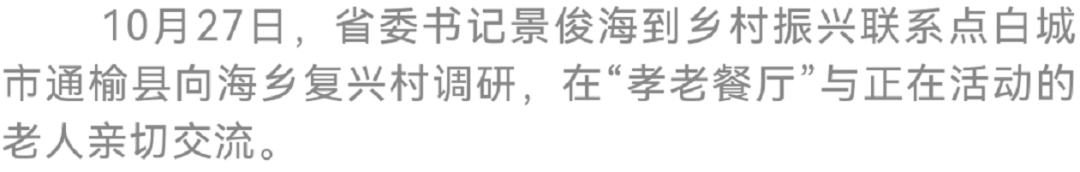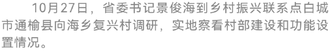 10月27日,省委书记景俊海到乡村振兴联系点白城市通榆县向海乡复兴村调研。他强调,要深入贯彻习近平总书记关于乡村振兴的重要论述和视察吉林重要讲话重要指示精神,扭住目标不放松,脚踏实地往前走,埋头苦干,绵绵用力,久久为功,锲而不舍巩固拓展脱贫攻坚成果,扎实推动乡村振兴,持续促进共同富裕。