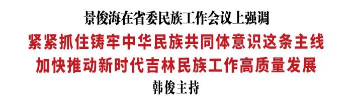景俊海强调,做好新时代吉林民族工作,是持续推动吉林振兴发展的坚实基础,是有效维护国家安全稳定的迫切需要,是巩固和发展平等团结互助和谐社会主义民族关系的必然要求,是更好实现共同富裕目标的前提保障。一要扎实推进中华民族共有精神家园建设,引导全省各族群众牢固树立正确的国家观、历史观、民族观、文化观、宗教观。二要持续推动民族地区高质量发展,深入推进兴边富民行动,支持民族地区产业发展,促进与国家区域重大战略对接;精心做好对口援疆援藏工作,不断巩固民族团结、增进民族亲情。三要推动各民族广泛交往交流交融,深入持久开展民族团结进步创建,促进各民族群众守望相助、手足情深。四要全面提升民族事务治理水平,坚持和完善民族区域自治制度,健全民族工作法规体系,严格依法治理民族事务。五要坚决防范民族领域重大风险隐患,切实维护民族团结和边疆稳固。