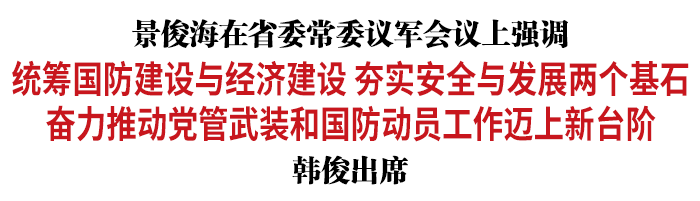 11月26日,省委书记、省军区党委第一书记景俊海主持召开省委常委议军会议。他强调,要深入贯彻习近平强军思想和党的十九届六中全会精神,坚决拥护“两个确立”、坚决做到“两个维护”,统筹国防建设与经济建设,夯实安全与发展两个基石,奋力推动党管武装和国防动员工作迈上新台阶。省委副书记、省长韩俊出席会议。