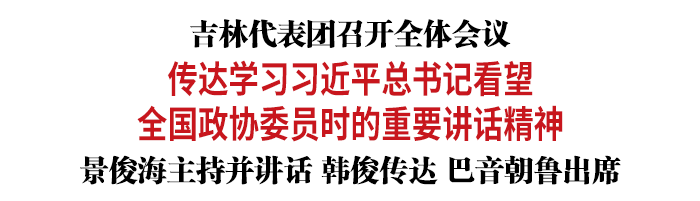 3月7日上午,吉林代表团召开全体会议,传达学习习近平总书记看望全国政协委员时发表的重要讲话精神。代表团团长景俊海主持并讲话,副团长韩俊传达,巴音朝鲁出席。