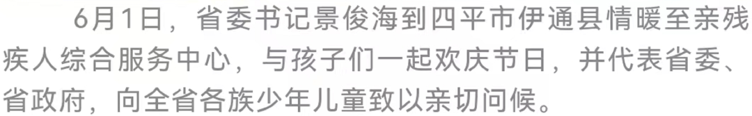 6月1日是“六一”国际儿童节,省委书记景俊海到四平市伊通县情暖至亲残疾人综合服务中心,与孩子们一起欢庆节日,并代表省委、省政府,向全省各族少年儿童致以亲切问候,祝他们学习进步、快乐生活、茁壮成长,要求各级党委、政府深入贯彻习近平总书记在致信祝贺中国儿童中心成立40周年时的重要指示精神,为全省少年儿童健康成长、全面发展创造良好环境。