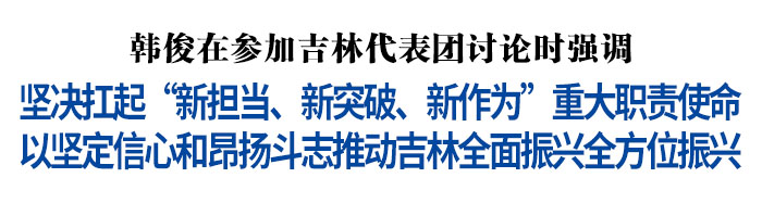 6月19日,韩俊同志在参加省第十二次党代会吉林代表团讨论时强调,要深入学习贯彻习近平总书记视察吉林重要讲话重要指示精神,全面落实省第十二次党代会部署,坚决扛起“新担当、新突破、新作为”重大职责使命,把握新发展阶段、贯彻新发展理念、构建新发展格局、推动高质量发展,以坚定信心和昂扬斗志推动吉林全面振兴全方位振兴。